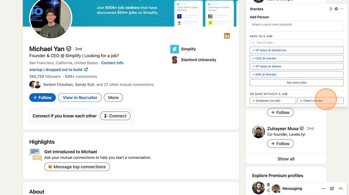 4\. To add someone as a client contact, click "Client Contact". This creates their profile in Stardex, marks them as a client, and marks their current company as a client company in Stardex as well. This is best used for BD contacts.