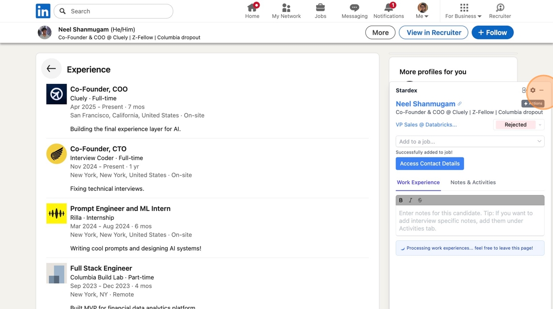 2\. Stardex will update and tell you that it's processing work experiences, feel free to go elsewhere, we'll set the profile up under the hood. You can edit the candidate's status in all of their jobs or add them to a new job if desired.