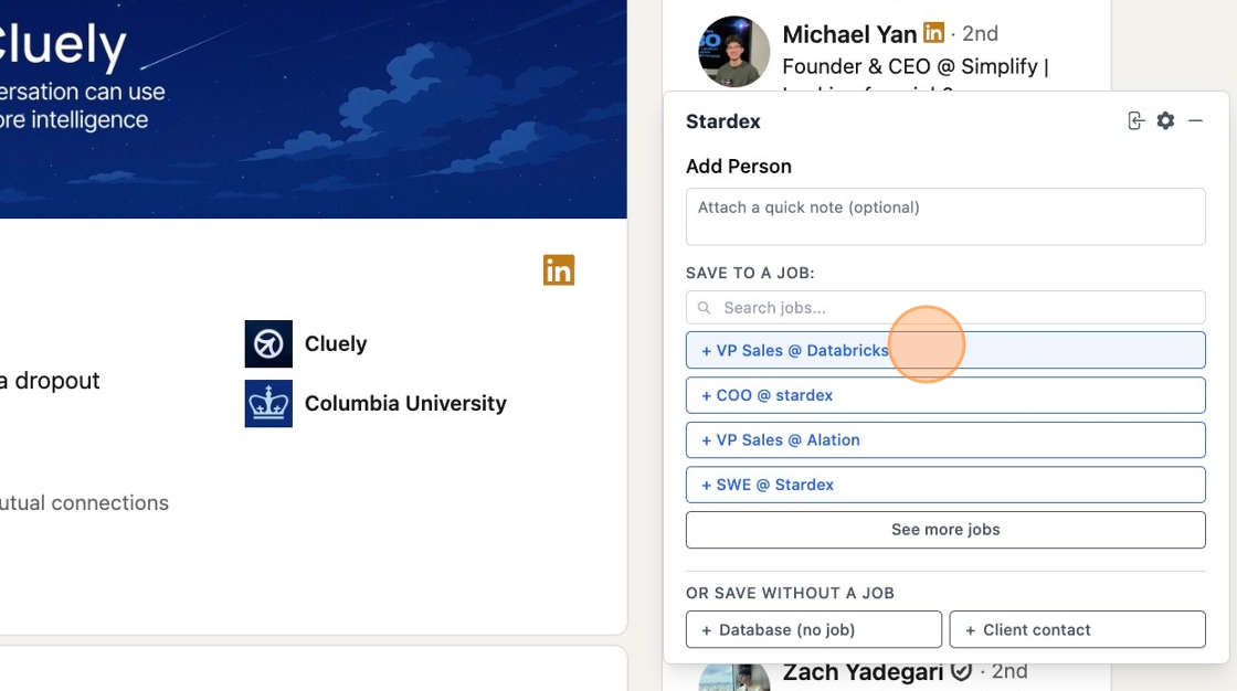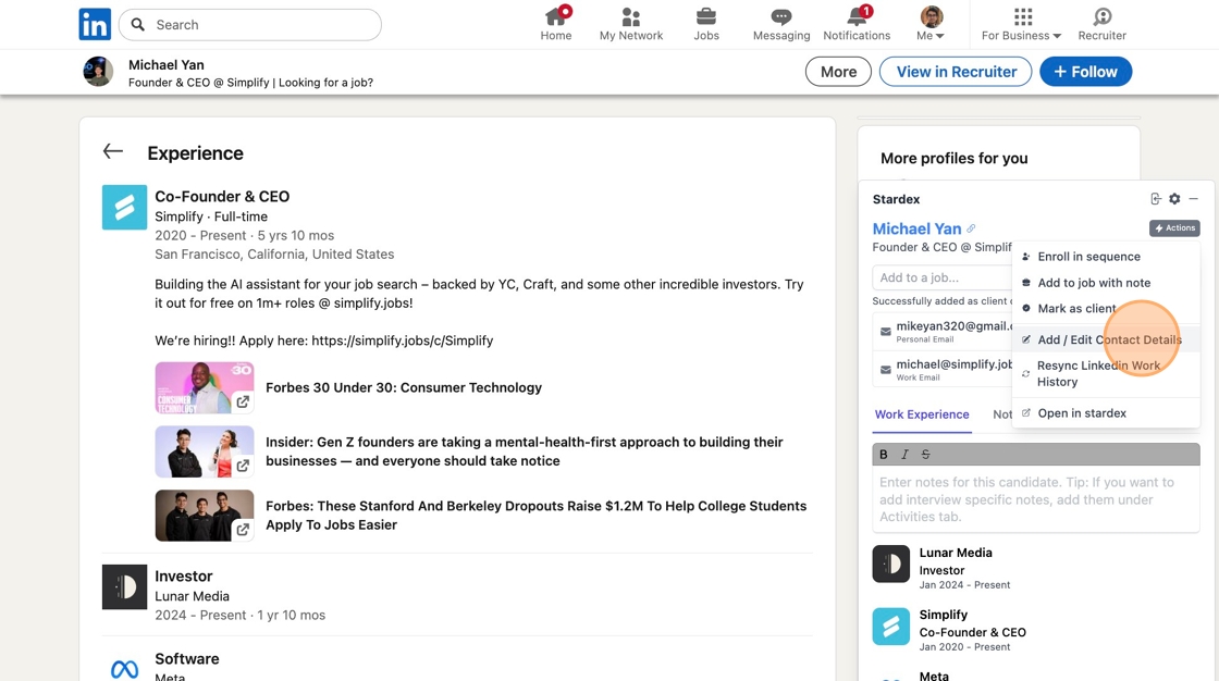 6\. Click the actions button. You can do a bunch of additional things there, such as manually editing or adding contact details and resyncing someone's work history (in case the data you have in Stardex is out of date due to a new job, etc).