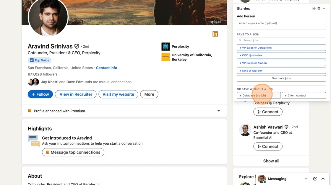 The Stardex Chrome extension is a fast, full-featured browser extension that allows you to add candidates into Stardex really quickly. It also lets you access contact details with our waterfall contact enrichment, take notes on candidates, modify their job pipeline stage, and more.