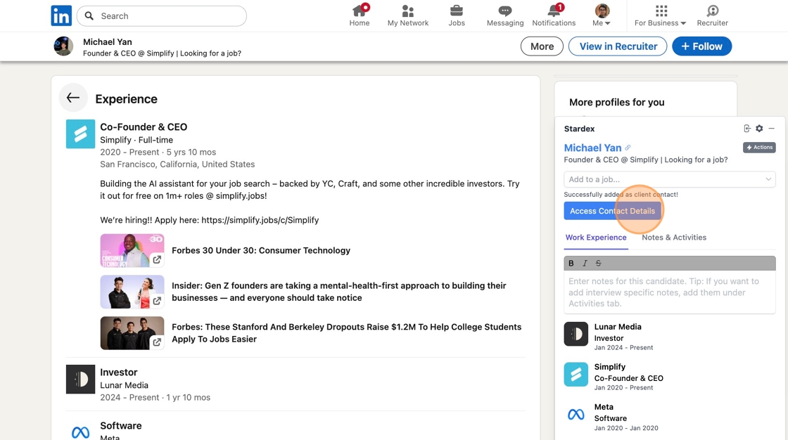 5\. Click "Access Contact Details" to get a person's email addresses. Stardex uses waterfall contact enrichment across 5 data providers to find personal and work emails. If you need phone numbers, please get in touch and let us know.