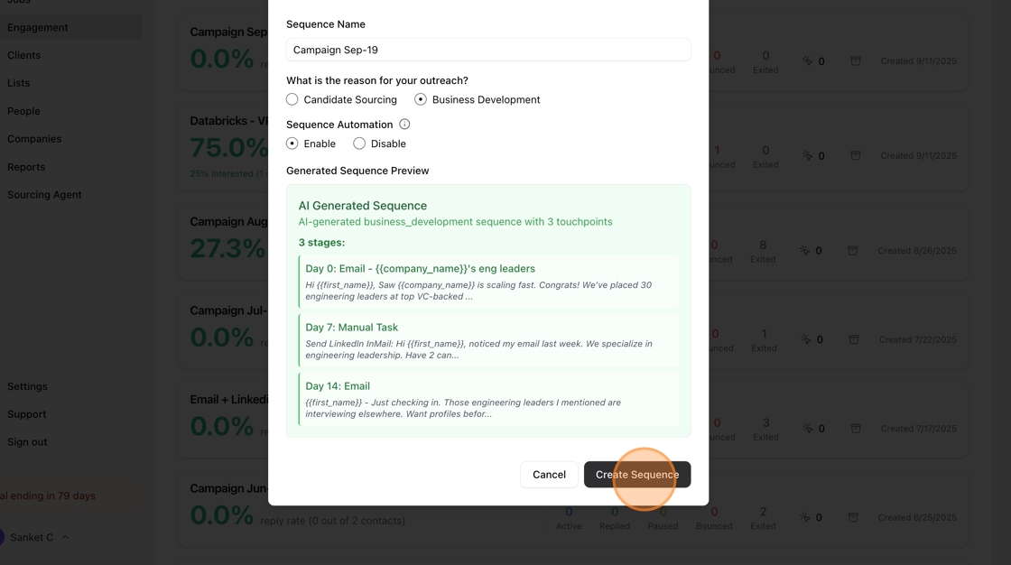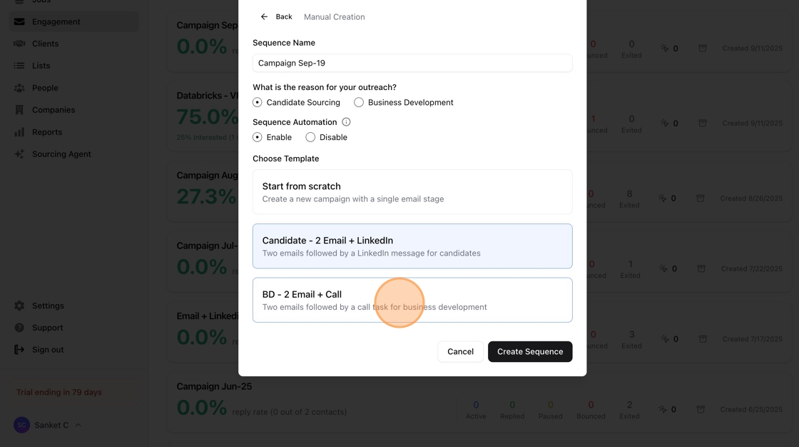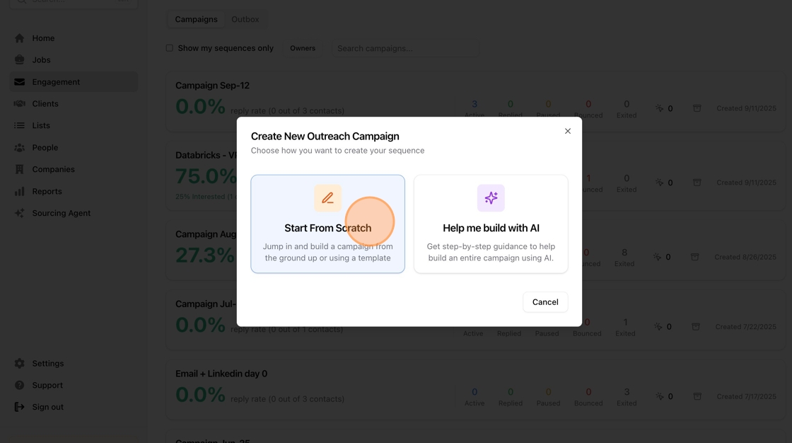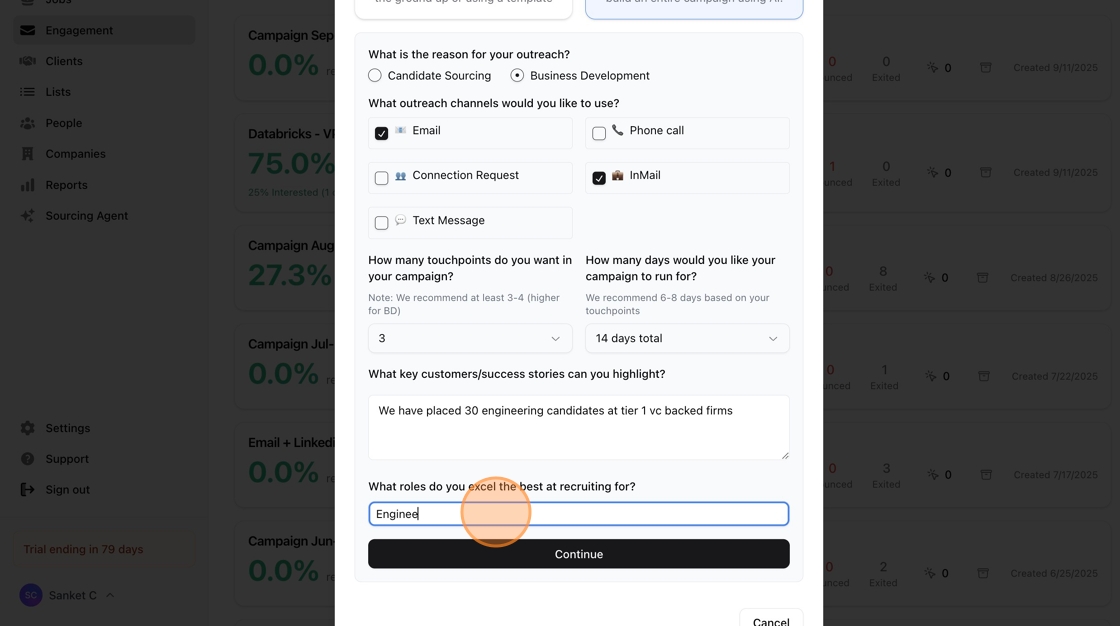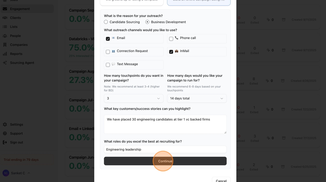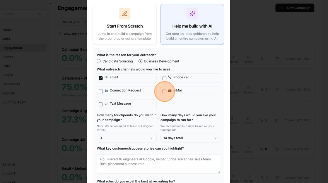 - If you want to use AI to build the campaign, pick the reason of outreach as well as the channels you would like to add.